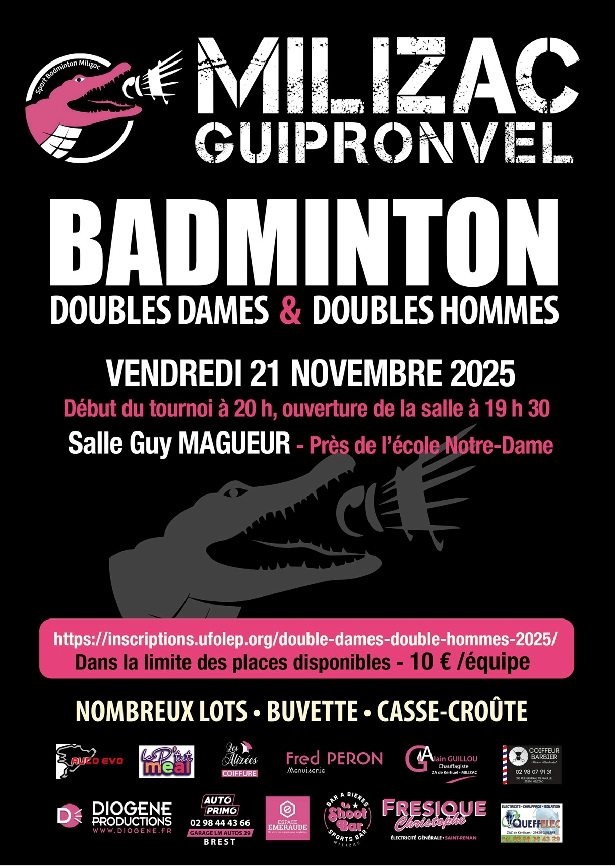 Salle Guy Magueur MilizacMilizac Badminton organise son Tournoi Double Dames et Double Hommes , Le vendredi 21 Novembre, accès à la salle Guy Magueur dès 19h15 début du tournoi 20h précise. Inscription 10€ par équipe (paiement possible en ligne), l’inscription se fait par ICI