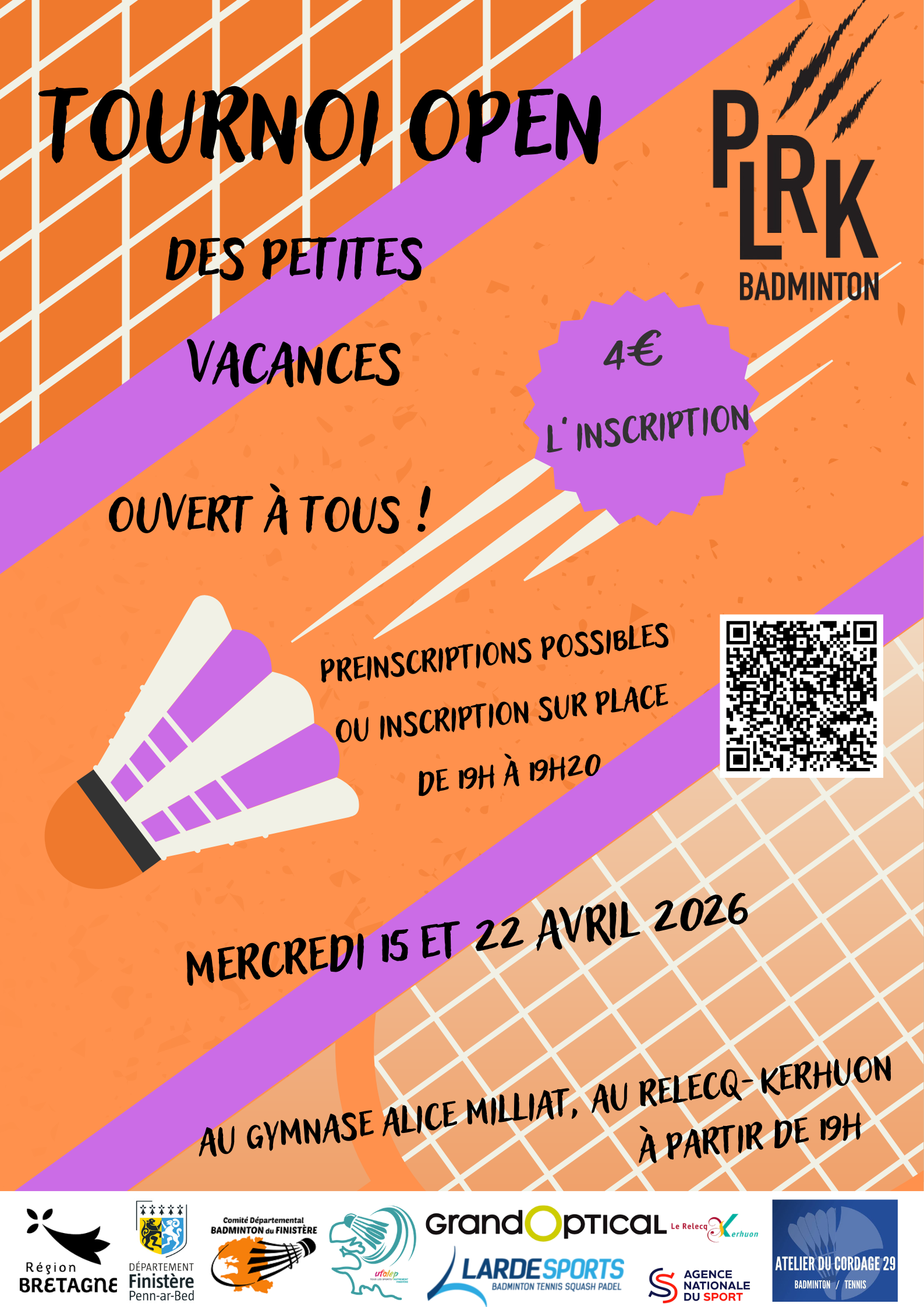 Le club du PLRK Badminton vous invite à participer à nos 2 tournois open (loisir) le mercredi pendant les vacances de pâques !