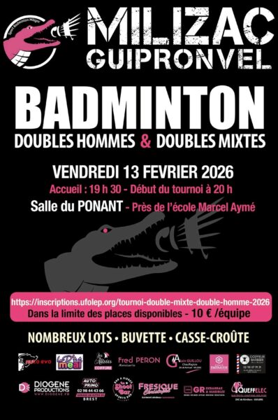 Le club de Milizac organise un tournoi loisirs, Double Mixte et Double Homme, limité à 16 place par catégorie.